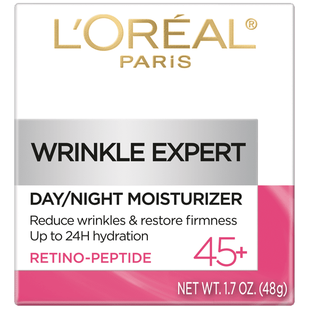 L'Oreal Paris Wrinkle Expert 45+ Day and Night Moisturizer; Wrinkle expert* 45 anti-wrinkle moisturizer is a part of L'Oreal Paris's first daily anti-wrinkle moisturizer line; which features formulas made for all of life stages. Skin can instantly feel softer and more supple once the wrinkle cream is applied. This daily anti-wrinkle moisturizer can help address the most common; age-related; noticeable skincare concerns. Wrinkles can appear visibly reduced and skin looks firmer. Formulated with retinol-peptide; this product effectively works to help improve skin smoothness and firmness.