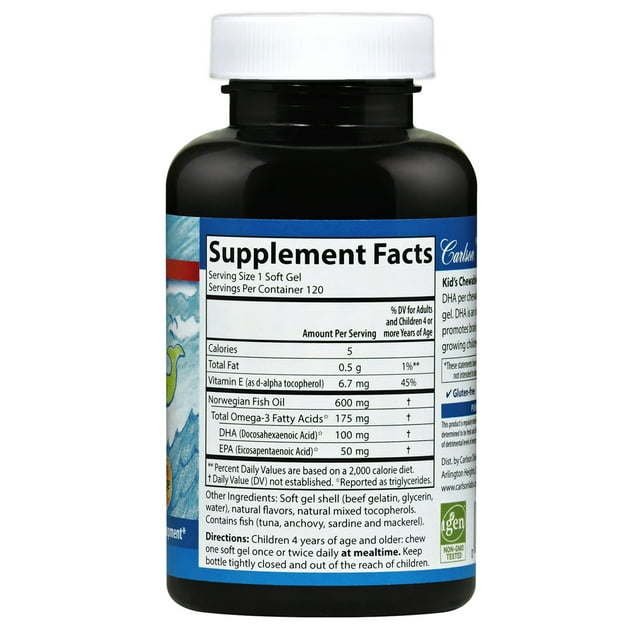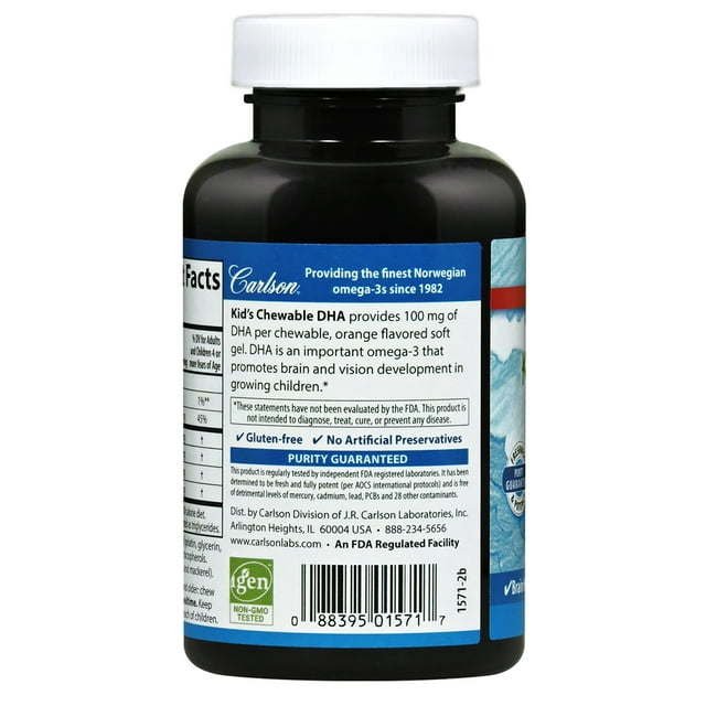 Carlson Labs Carlson Kid's Chewable DHA Bursting Orange Flavor 120 Soft Gels Carlson Labs Carlson Kid's Chewable DHA Bursting Orange Flavor is a fun and tasty way to provide your children with the nourishing benefits of DHA Omega-3 oil. DHA is vital for healthy brain development and vision in growing children. Natural Vitamin E has been added to each soft gel to protect the freshness of EPA & DHA, both within the soft gels and our bodies.
