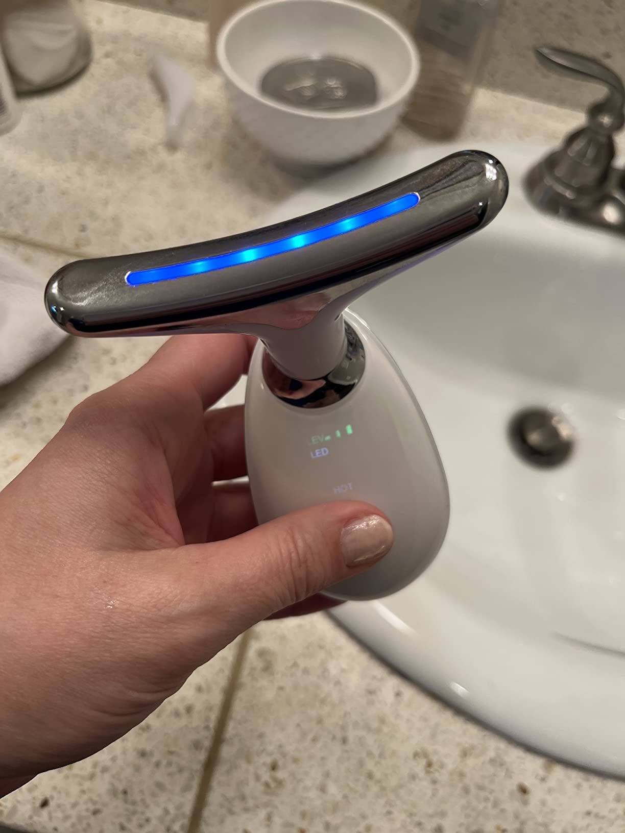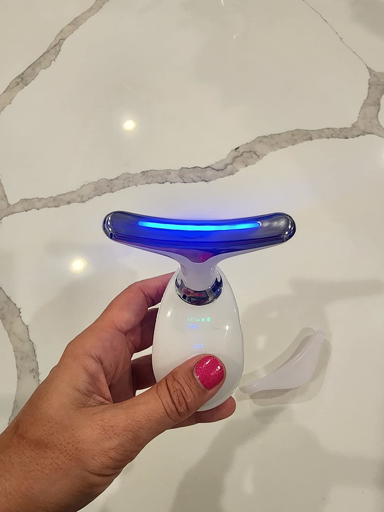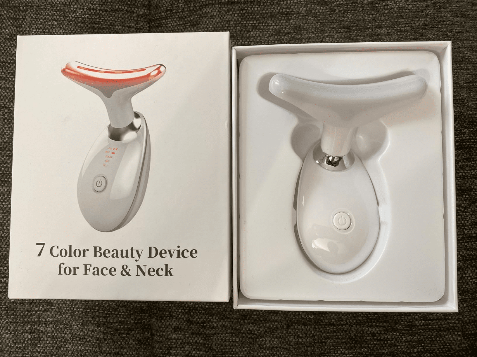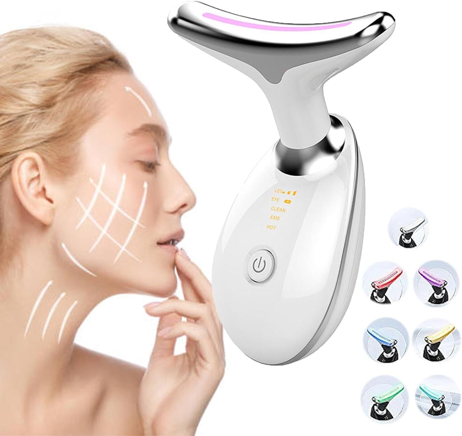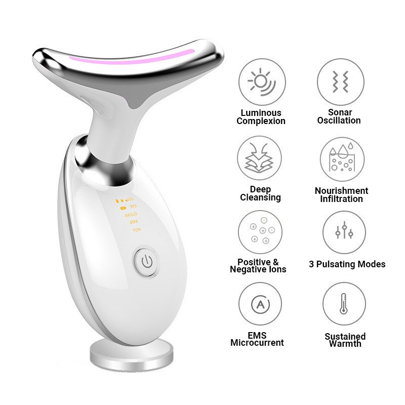 [Perfect Skin Care Tool] This skin tightening device for face and neck can be used with your favorite cream or lotion to help your skin absorb the cream or lotion faster and more fully so that it can smooth and tighten your skin, increase skin elasticity and softness, and maintain healthy glowing skin. That is because the face neck massager can reach and maintain a constant temperature of 45 degrees Celsius(or 113 degrees Fahrenheit).[Anti-Aging for Face and Neck] This multifunctional face neck massager has 7 different LED light modes that are not only suitable for massaging the face, neck but also can be used to massage the arms, shoulders and other parts, tightening the sagging skin and relaxing the muscles.[Face Neck Massager] The CLEAN Mode can clear the pores and keep your skin clean and glow; The second Mode can relax your skin, help your skin absorb skin care products and reduce fine lines and wrinkles; The HOT Mode can tighten the sagging skin and promote collagen production, thus rejuvenating your skin. This LED light wrinkle removal device contains 7 LED light modes. More options for various skin problems![Exquisite Design] This wrinkle removal tool is designed to be compact and portable that can be put in a cosmetic bag, carried with you and used any time & any where. The curve of its massage head that is 160 degree can fit your face and neck perfectly.[Timely Help] We will always be your timely and patient helpers. Please feel free to contact us if you have any problems.