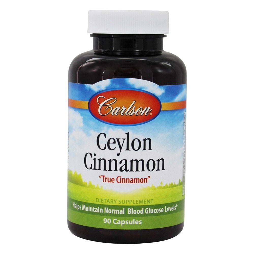 Carlson Labs Ceylon Cinnamon 500 mg. - 90 Capsules Carlson Labs Ceylon Cinnamon contains 500 mg. Cinnamomum verum bark per serving. Carlson Labs Ceylon Cinnamon helps maintain normal blood glucose levels that are already within a normal range.The reduction averaged 18 to 29% in the three treatments groups, and 1 gram per day was as effective as 3 and 6 grams per day. The benefits of cinnamon for lowering blood sugar levels was confirmed in a double-blind study. However, in two other double-blind studies, cinnamon was not more effective than a placebo.