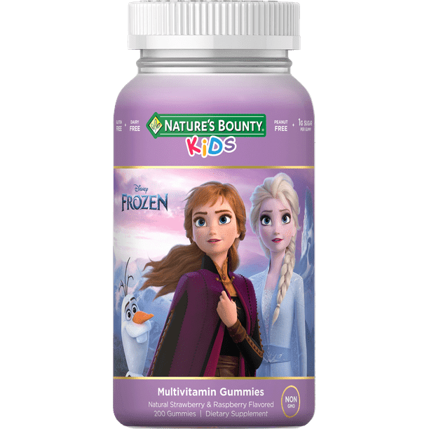 Nature’sbounty disney® frozen kids multivitamin gummies look like their favoritedisney® frozen heroes and taste great. Children ages 4 and up get as much:vitamin a as 13 cups of broccoli; vitamin c as ⅔of an orange; vitamin d as 6 cups of milk; and vitamin b6 as 4 green; shinyavocados from just two gummies!† you’ll find 13 key nutrients that supportkids’ immune system; eyes; bones; antioxidant health & energy metabolism.Plus; there are no gmo’s; gluten; wheat; milk; lactose; artificial flavors& artificial sweeteners; peanuts; egg; soy; fish; sesame; and 1g of sugarper gummy. Eachchildren’s supplement is backed by 50 years of trusted; guaranteed quality. Ourtrusted products are always backed by science and made with only the purestingredients that are laboratory tested.