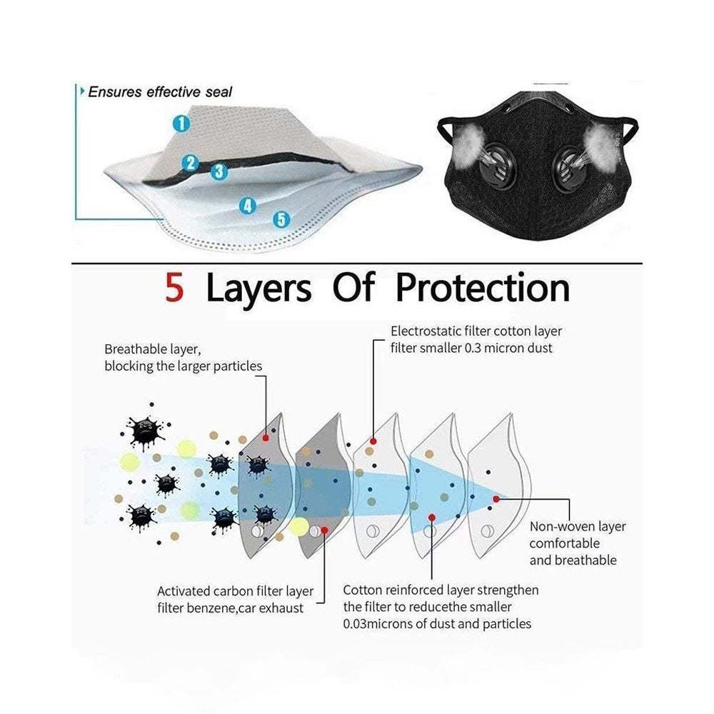 ThisVivzone Activated Carbon Sport Face Maskhelps you breathe clean fresh air in any environment by filtering up to 95% of particles as small as 0.3 microns, including bacteria, viruses, germs, exhaust, dust, chemicals, pollen, smoke, and fumes.