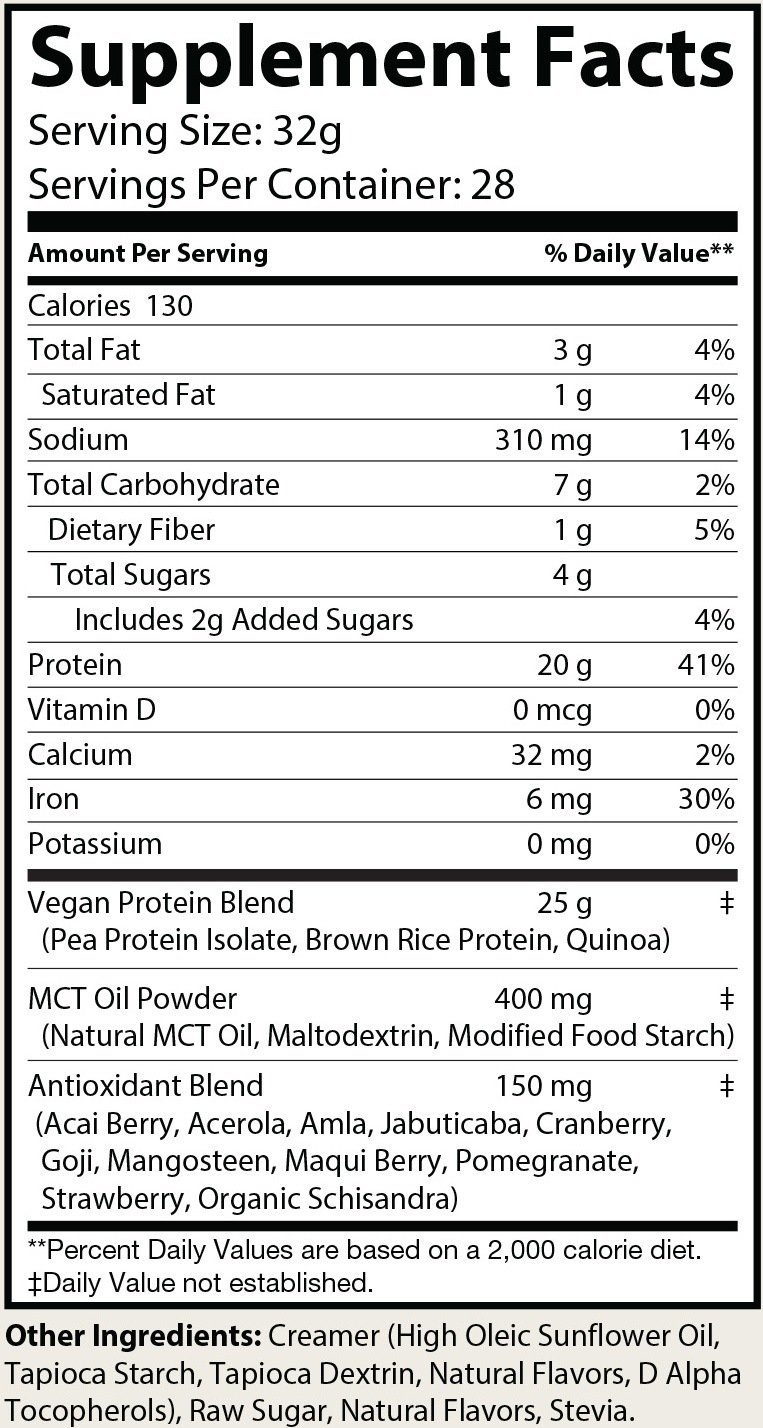 Pea protein absorbs really well in the body, to ensure a complete protein profile with all the essential amino acids, we blended it with brown rice protein and quinoa protein. Brown rice contains fiber which will help you stay fuller for longer as well as help with regular bowel movements and gut bacteria health. With the addition of MCT (medium chain triglyceride) you also get the benefit of additional healthy fats. This can help if you find yourself lacking in healthy fats in your diet.